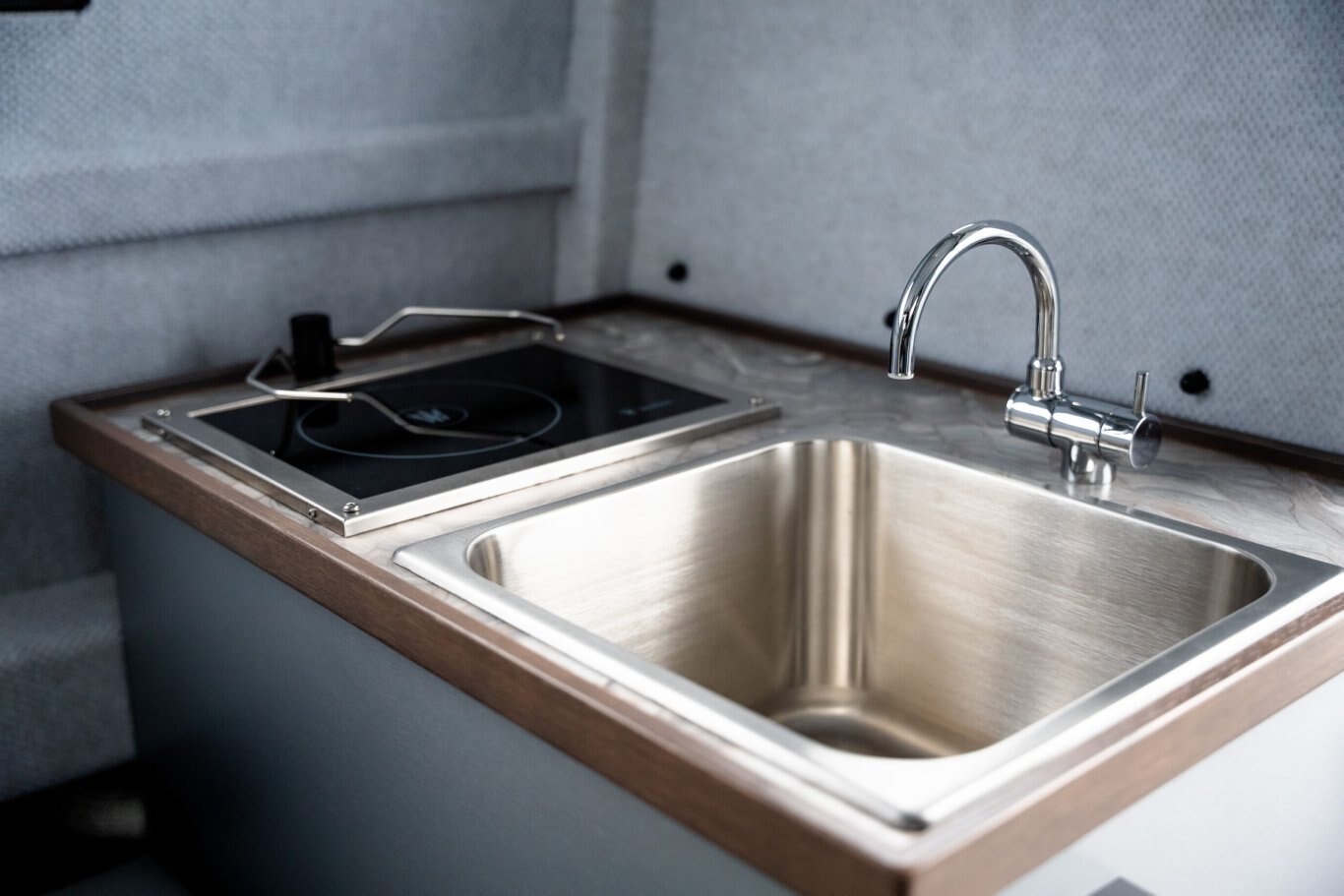 • Starboard side aluminum galley cabinet with stainless sink, faucet refrigerator and fresh water holding tank