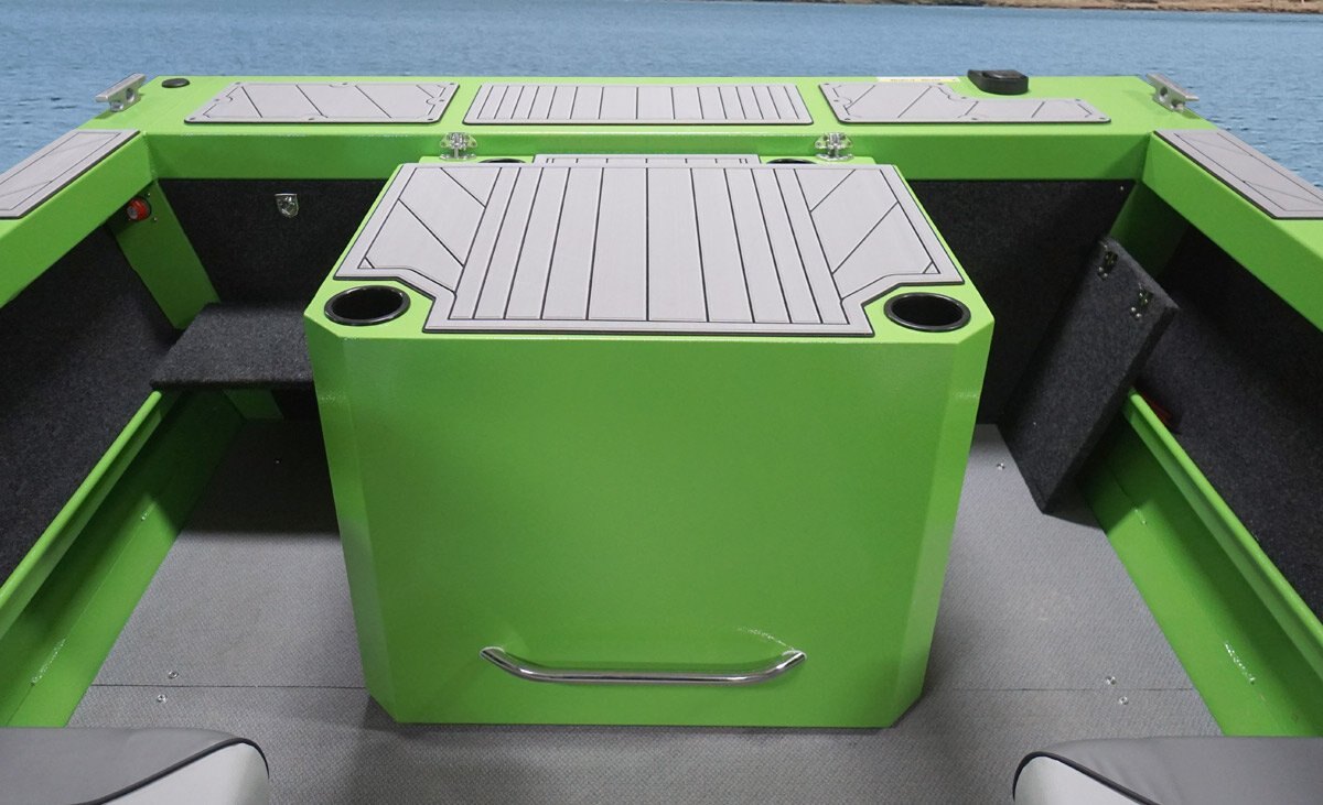 Standard Interior Features Easy care marine vinyl floor KingDeck marine material – cockpit interior accents 2 Fishmaster XL seats with pinchless hinges on pedestals Jet helm and steering wheel Navigation and anchor light storage 6 Drink holders Integrated helm footrests